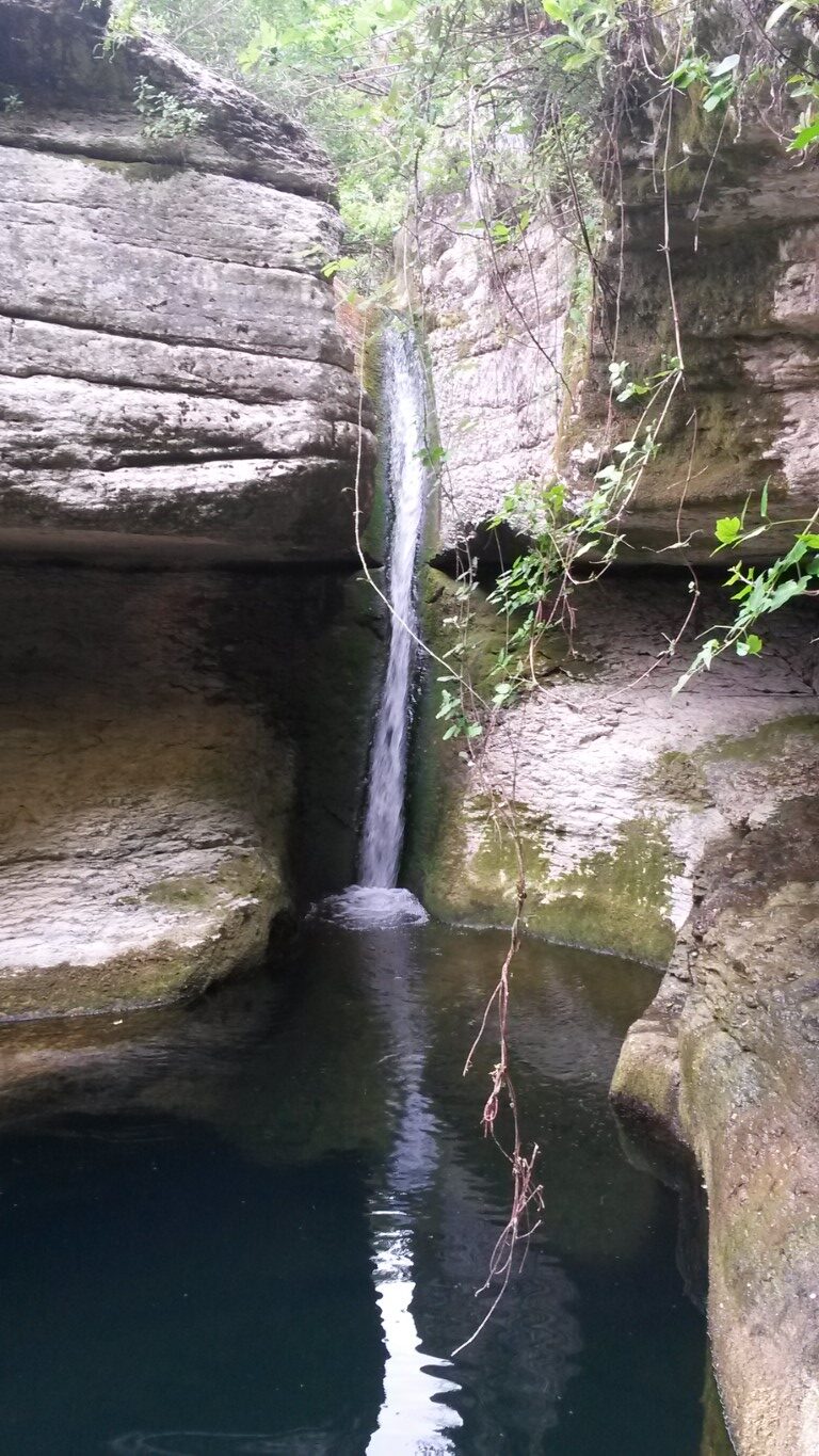 Nella marmitta l’acqua si versa con un breve piano inclinato e una gradevole cascatella finale. A voi la scelta di fare scivolo con il sedere, oppure tuffarvi con cautela da una delle rocce sovrastanti oppure ancora raggiungere il bordo ovest del laghetto attraverso uno stupefacente cunicolo scavato, chissà da chi e quanto tempo fa, all’interno della parete calcarea che lo delimita. In ogni caso, massima attenzione nel praticarne il bordo, stante il pericoloso precipizio che si trova dall’altro lato e che rappresenta il pericolo maggiore dell’escursione.