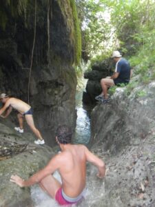 L’escursione sul torrente. Comincia ora il vostro acqua-trekking, con il percorso che si snoda nel fondovalle dove scorrono acque limpide e fresche, e che seguendo la corrente vi porterà in circa 90 minuti al laghetto terminale. Il cammino è in acqua per l’intero percorso, anche se sulle sponde troverete, ma solo in due casi, passaggi che vi eviteranno un bagno completo, se proprio desiderate rinviarlo al laghetto terminale. Tranne che in questi due casi, le sponde non sono percorse da sentieri o comunque percorribili.