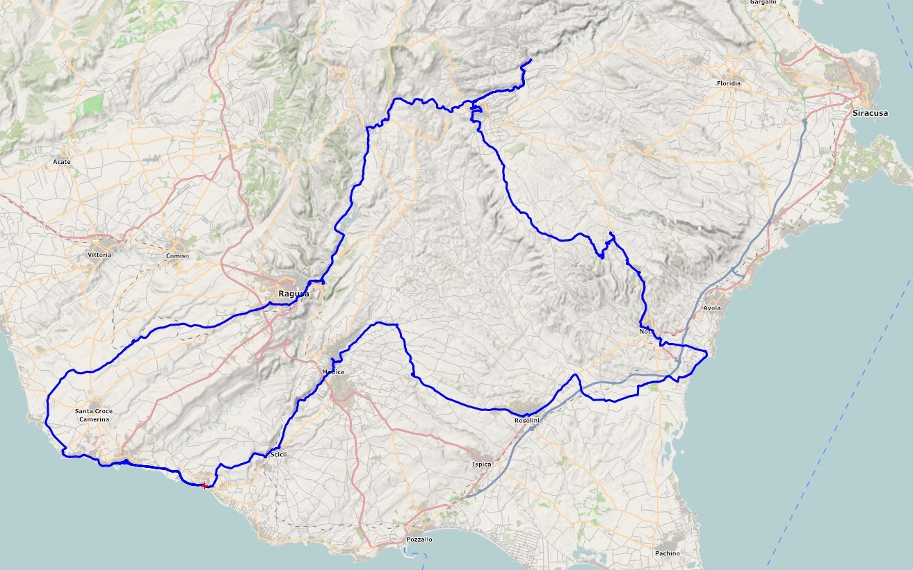 Dopo squisita colazione, una stradina in gradevole discesa conduce alla vecchia stazione ferroviaria e alla preziosa ciclabile ricavata sulla dismessa linea Siracusa – Ragusa, raggiunta la quale prendiamo a sinistra, verso ovest. Presto una strada secondaria asfaltata, ricavata sul sedime ferroviario, ci conduce a Giarratana. Da qui, per una SS 194 povera di automobili, scavalchiamo il lago di Santa Rosalia e in compagnia del fiume Irminio raggiungiamo Ibla, quartiere gioiello del capoluogo ibleo. Facile ora puntare verso Modica, Scicli e Marina di Ragusa; tuttavia, se il tempo a disposizione lo consente, converrà invece dirigerci verso il Castello di Donnafugata. Dal quale dopo una discesa fra i carrubi del tipico paesaggio ibleo, si perverrà al borgo marinaro di Puntasecca, reso famoso per la “Casa di Montalbano”, per poi raggiungere Marina di Ragusa pedalando sulla nuova ciclabile che costeggia il mare. Le stazioni ferroviarie sono quelle della “Ferrovia del Barocco”, ovvero Scicli, Modica, Rosolini, Ispica, Noto, Ragusa Ibla, con recapito finale a Siracusa, stazione connessa con Catania e da qui per il continente. Si può partire anche da Noto.